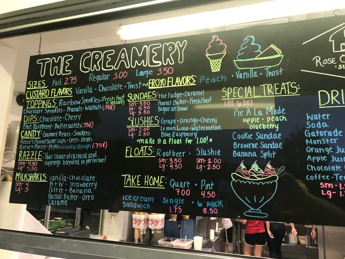 The creamery serves soft serve ice cream, both chocolate or vanilla with a variety of toppings. I had the old stand by-chocolate milkshake and Maureen had a small chocolate ice cream with chocolate “shots” on a wafer kiddie cone. Tasty, rich and creamy and reasonably priced. Staffed by a group of young, spunky girls make Rose’s a nice attraction.