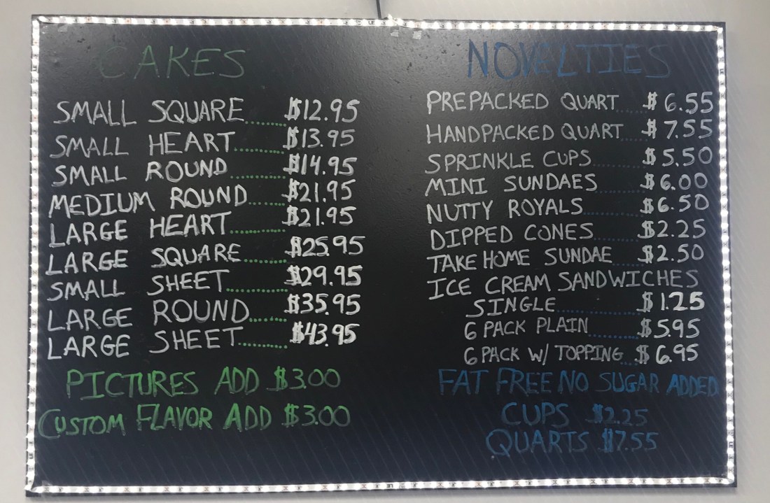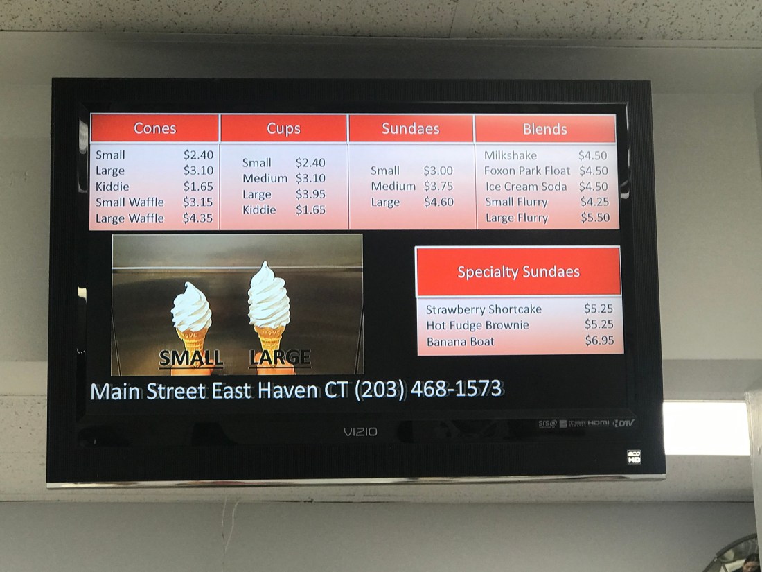 The ice cream is a home grown product, made fresh every morning by father and son. Multiple flavors, some standard some unique. Soft serve as well and they also serve Libby’s Italian Ice, a New Haven staple. But what seems unique are the other products: ice cream sandwiches, cakes and pies! All the prices seemed very reasonable.