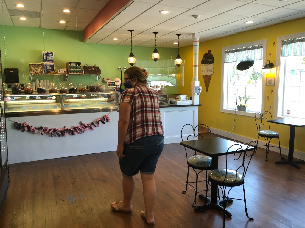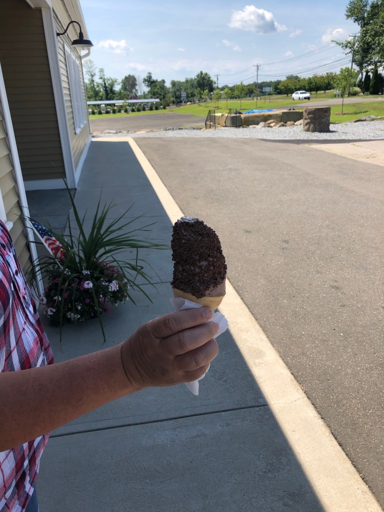 With no coffee ice cream, what to do. I went for a chocolate milkshake with hard ice cream while Mighty Mo went for soft chocolate on a sugar cone with chocolate sprinkles. The shake was nice and thick and smooth on a hot 90F+ day while Maureen enjoyed her soft chocolate on a water cone.