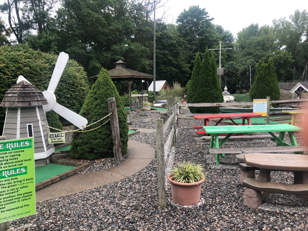 Spent another gray, cloudy Sunday afternoon exploring the Connecticut country side. Today we headed to the northwest hills but got sidetracked with some showers so we altered our course and ended up in the village of Winsted in the town of Winchester. Winsted is the “downtown” section of Winchester and we found a nice ice cream and mini-golf place called R&B Sports World that has a challenging 18 hole mini-golf course, batting cages, go-cart track and an arcade. When we arrived the place was hopping with many, many kids running around but we had the mini-golf course to ourselves.