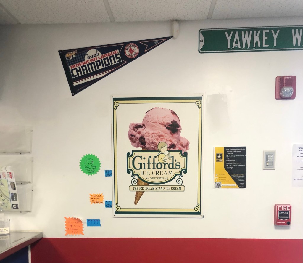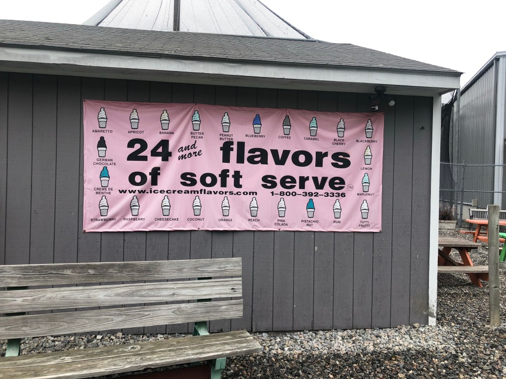 After we completed our 18-hole odyssey, we stopped inside for a treat. As the sign says they offer 24 different soft serve flavors and a dozen Gifford hard ice cream options. I went for a kiddie cup of Gifford’s mint, chocolate chip and with 24 soft serve flavors Mighty Mo had…yes, chocolate soft serve with chocolate sprinkles on a wafer cone. Both were delicious and hit the spot after a damp 18 holes.
