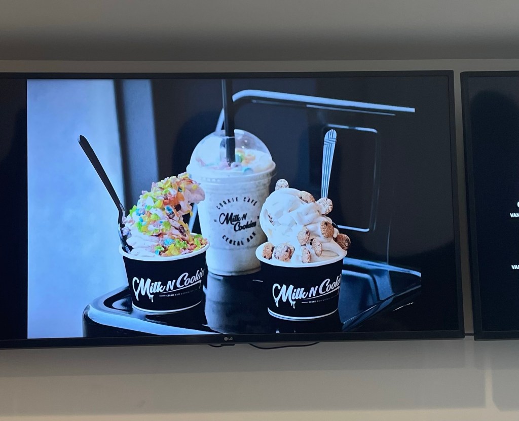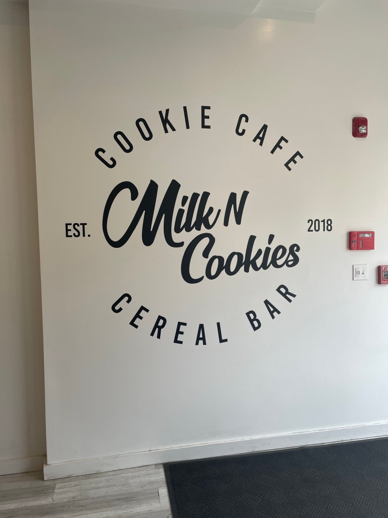Milk N Cookies offers only the three traditional ice cream flavors…chocolate, vanilla and strawberry from the New Jersey creamery Jack and Jill Ice Cream…and they mix various varieties of breakfast cereal in the ice cream with a number of traditional toppings. I had a thick, rich and creamy chocolate milk shake. Maureen passed on ice cream and had a large, chocolate chip cookie. Big surprise there! While Matt had a cup of chocolate with Heath Bar candy topping and Kristi had vanilla ice cream with Heath Bar candy topping too. Sounds like two peas in a pod there all right!
