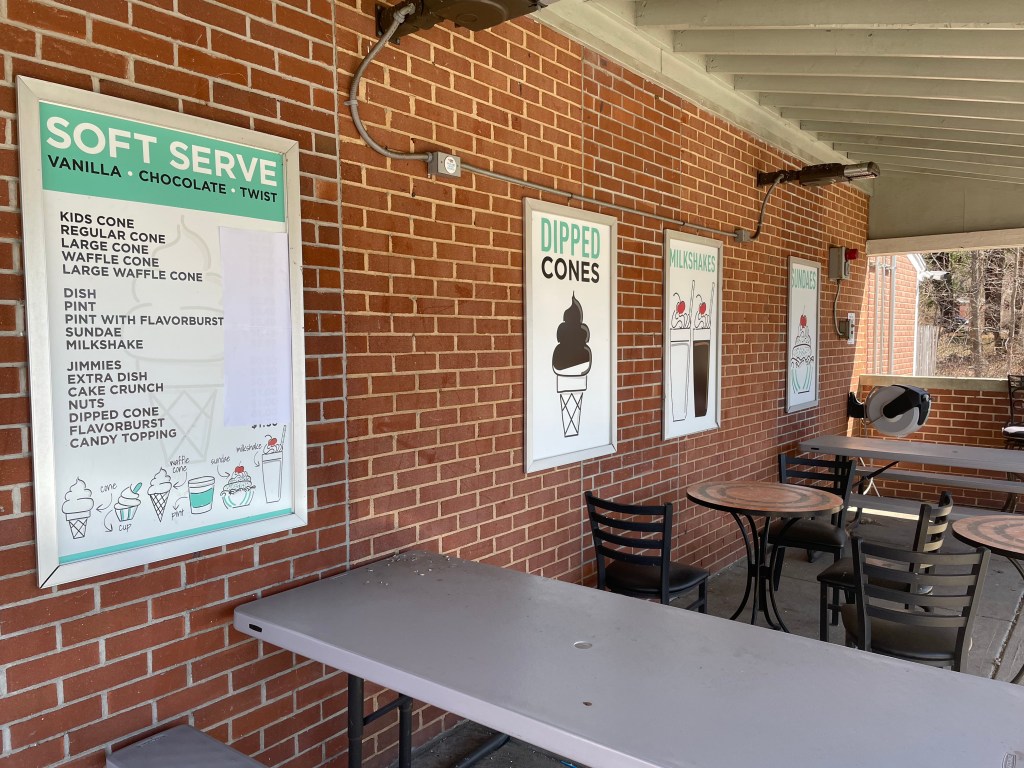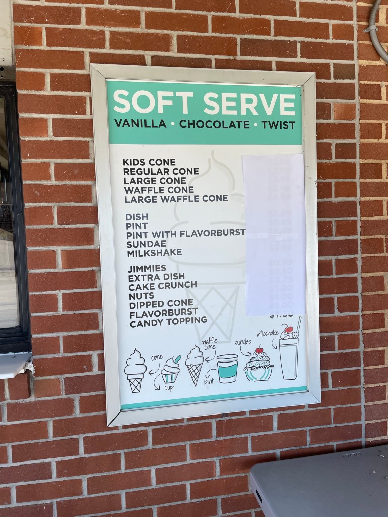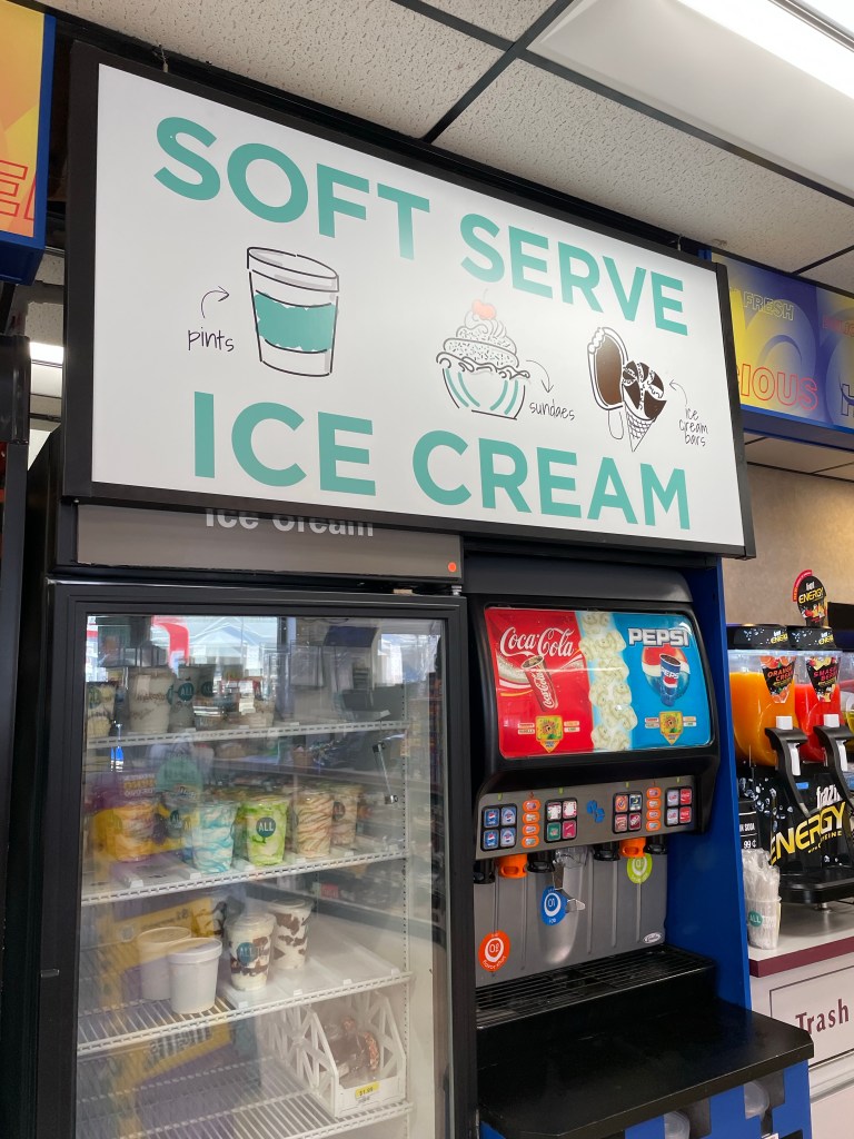 This is an Exxon gas station with an XtraMart convenience store that serves their own soft/serve product. They have chocolate and vanilla and offer cones, cups, shakes and ice cream sandwiches. Much to Maureen’s, my soft serve specialist, shock their machines were not operating. But much to my surprise they have a nice selection of pre-made mixes and ice cream sandwiches.