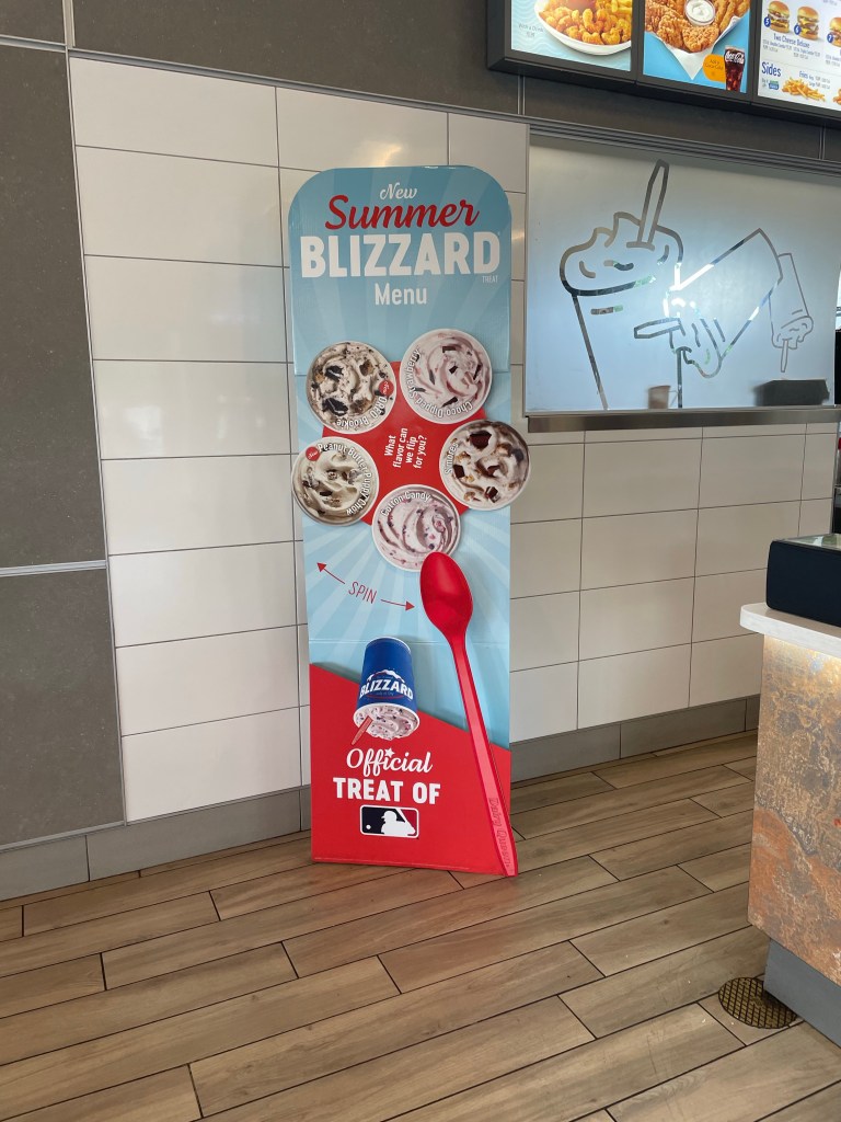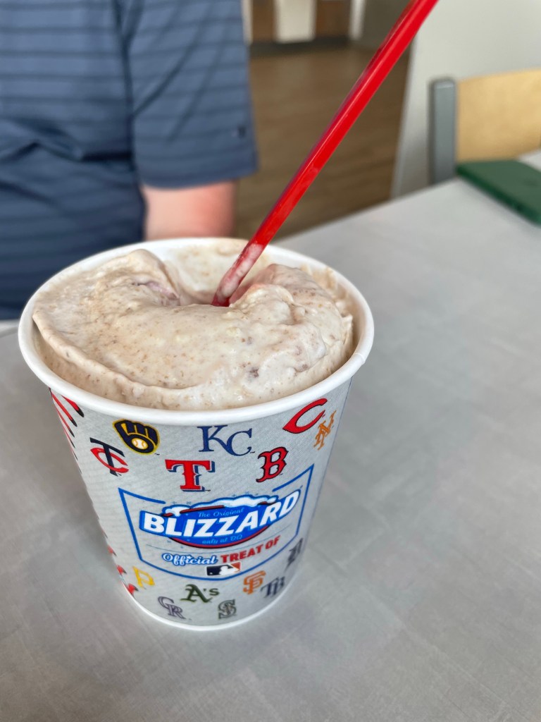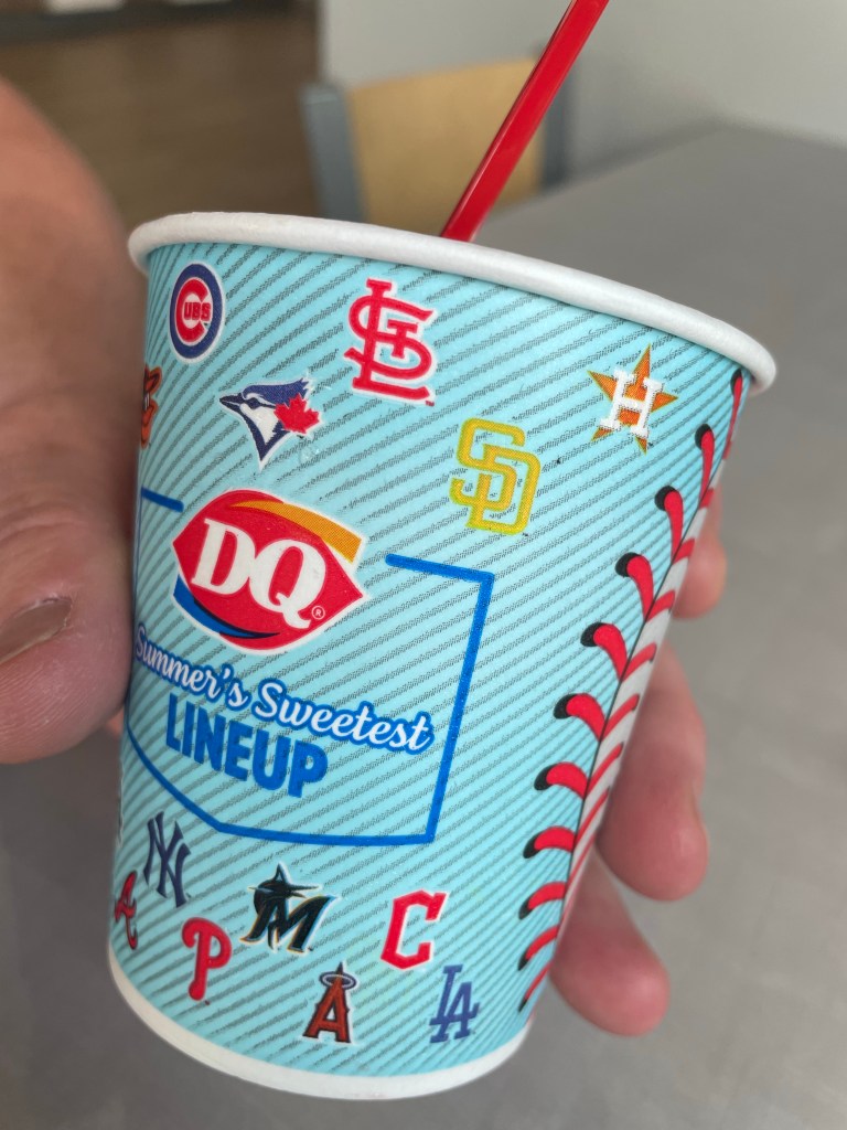 In addition to a wide variety of concoctions they sell ice cream cakes and my favorite Dilly Bars, prepackaged to go. I went with a small chocolate soft serve on a wafer cone (sorry Mo) and Conrad went for the classic strawberry shortcake Blizzard that is also celebrating Major League Baseball.