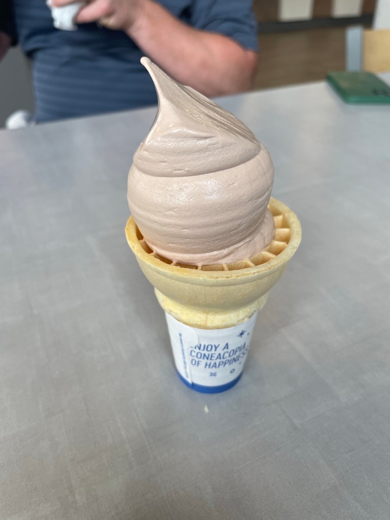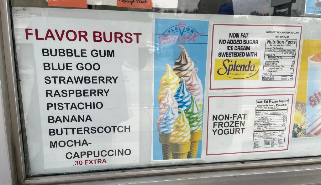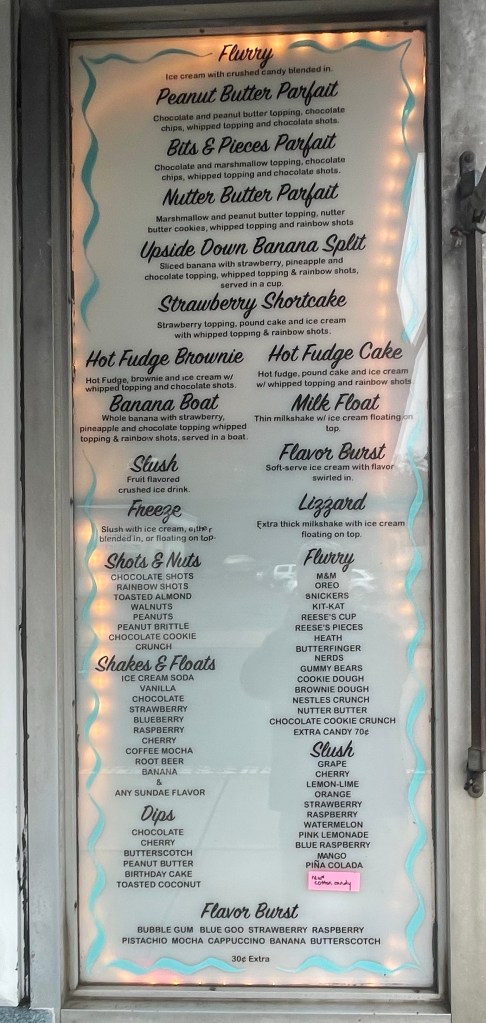 The young lady working the place on a chilly Sunday was pleasant and helpful. She made a nice, small soft-serve chocolate milkshake. Maureen was excited for her kiddie cup of chocolate-vanilla twist with chocolate “shots.” My soft-serve specialist Mighty Mo thought the dairy products are from Hershey Ice Cream as the young lady behind the counter was uncertain.