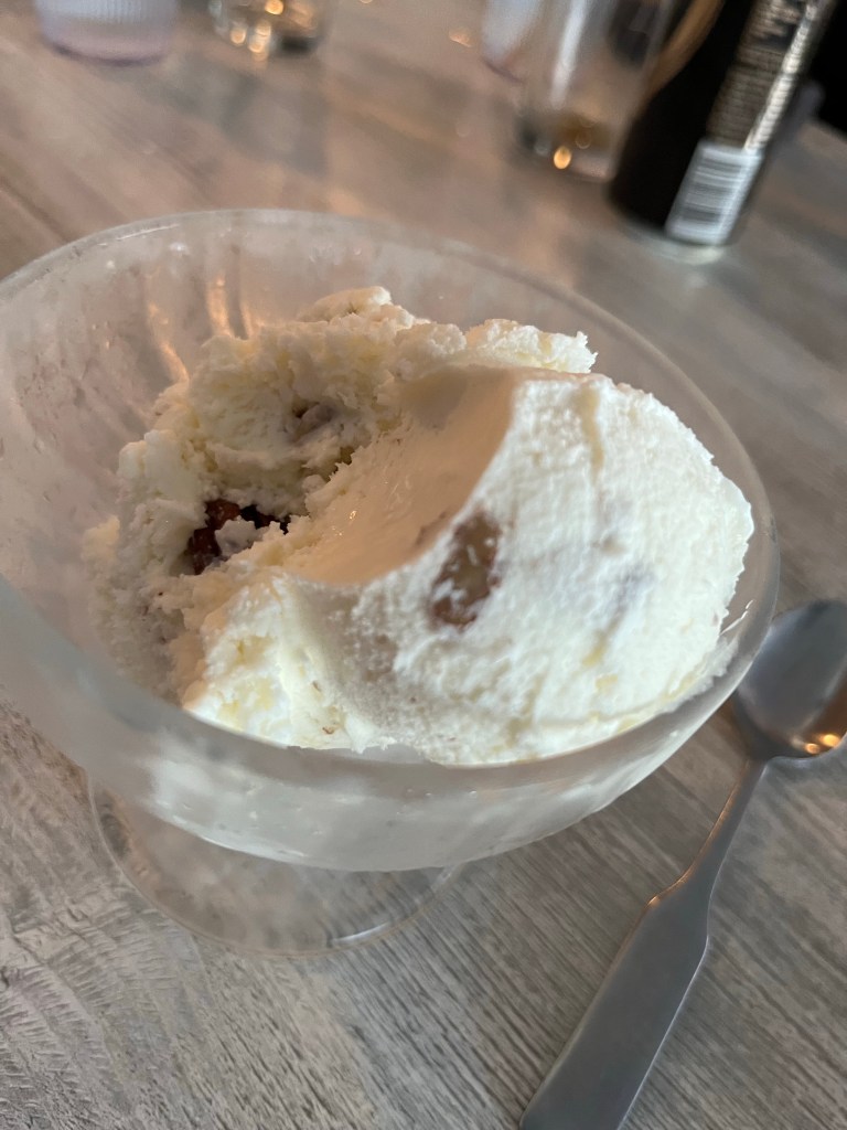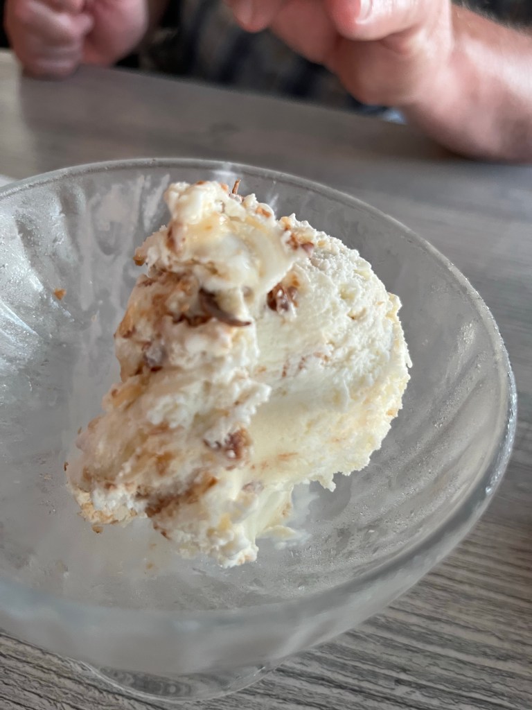 After dinner our waiter asked about dessert and after some playful ribbing from my “brother” Jim about my ice cream obsession, we tried two flavors. I had maple pecan that has a nice sweet cream base with whole pecans and maple syrup ribbons throughout. Jim had toasted coconut which has a nice sweet cream base with crunchy coconut throughout. Both were fantastic and I suppose we will agree to disagree on which was better but both were fantastic.