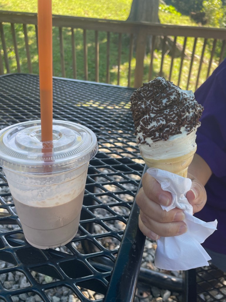 Maureen had a kiddie cone with chocolate soft serve with chocolate “shots” or sprinkles for rest of us. I had a small chocolate milk shake. Both were rich, rich, rich in flavor and tasty. My shake with thick, well made and delish and Mighty Mo said this was some of the best soft serve she has had this summer!